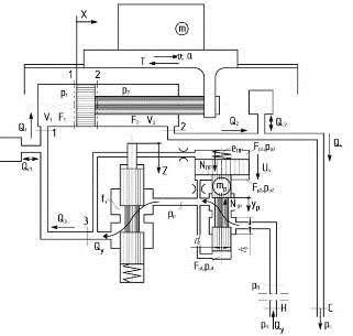 еПР, NПР - жесткость и сила пружины редукционного клапана;Р1, pР2, pР3 - давления в полостях редукционного клапана, МПа;ГР - осевая составляющая реактивной гидродинамической силы в редукционном клапане;У, Q4 - расходы жидкости соответственно в напорной и сливной линиях, м3/сек;С1, QС2 - расходы жидкости, определяемые сжимаемостью ее в поршневой и штоковой полостях ГЦ и присоединенных к ним исполнительных линиях, м3/сек;У - площадь проходного сечения рабочей щели УГУ,м2;