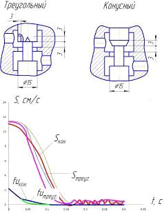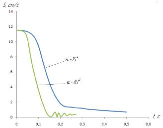 Влияние величины РП сказывается только в нижней части диапазона подач (рисунок 4.7). Если при больших подачах кривая скорости имеет плавный монотонный характер, то при малых подачах наблюдается колебание скорости в конце переходного процесса. Это можно объяснить влиянием падающей характеристики трения, которое проявляется в большей степени при малых РП.