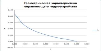 На этом графике приведена форма рабочего элемента, позволяющая получить геометрическую характеристику, наиболее близкой к заданной. В данном случае наиболее близкое совпадение фактической и заданной характеристики обеспечивается при цилиндрическом золотнике с треугольными пазами. Изучив график получаем, что на геометрическую характеристику УГУ оказывают влияние параметры привода. Анализ результатов расчета показывает, что давление питания оказывает незначительное влияние на геометрическую характеристику.