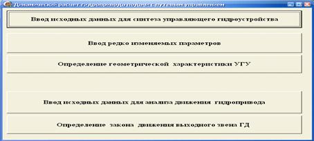 В данном разделе будет рассматриваться ход выполнения автоматизированного расчета синтеза УГУ, а также анализа движения гидропривода и исследование динамических характеристик гидропривода.