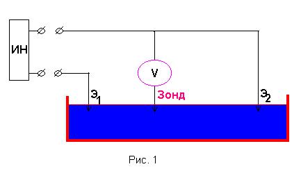 Установка представляет собой прямоугольную ванну с электролитом, в которую погружены два электрода (Э1 и Э2). Электроды присоединены к источнику постоянного низковольтного напряжения (ИН). Один из электродов через вольтметр связан с подвижным зондом. Вольтметр показывает напряжение между отрицательно заряженным электродом и точкой в ванне, в которую помещен зонд.