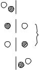 Каждому состоянию газа соответствует некоторое распределение его молекул по объему и определенное распределение молекул по скоростям. Предположим, что в сосуде находятся только две молекулы газа (рис. 11.6). «Цвет» молекул пусть будет соответствовать их скорости. Различные состояния газа различаются только распределением молекул по половинкам сосуда. Можно получить четыре различных распределения молекул. Вероятность каждого из них равна 0,25. Однако эта вероятность будет отличаться от вероятности термодинамического состояния системы. Дело в том, что в однородном газе все молекулы тождественны одна другой, т.е. они неразличимы. Поэтому два из четырех распределений будут тождественны одно