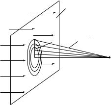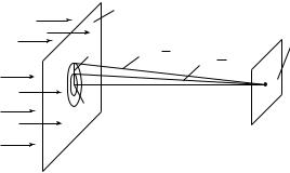 Из рис. 27.33, а видно, что дифрагирующие под углом ϕ лучи ВD и ЕК параллельны один другому и побочной оси СА. Именно под этим углом ϕ в точке А наблюдается первый максимум, интенсивность которого равна I1. В общем случае положение максимума при