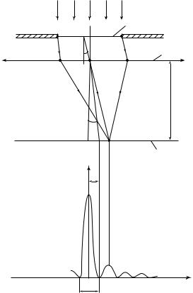 Пример 27.5. На щель шириной b = 0,15 мм падает нормально плоская волна (λ = 450 нм). С помощью линзы, оптическая сила которой D = 5 дптр, дифракционная картина проецируется на экран, находящийся в фокальной плоскости линзы. Определите ширину центрального максимума и угловое положение первого максимума. Какое число максимумов теоретически включает дифракционная картина и какое число из них можно наблюдать практически?