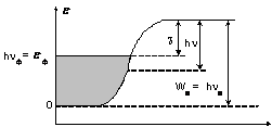 Следует ожидать, что с ростом частоты света n число фотоэлектронов сначала будет возрастать за счет электронов, занимающих уровни в интервале энергий между Wa - hn и предельной энергией eф (рис. 12). Если частота света n становится такой, что энергия кванта больше высоты барьера hn > Wa, то число фотоэлектронов больше уже не имеет причин возрастать (если пренебречь ионизацией электронов, не входящих в число электронов проводимости, а также падающей световой волной).