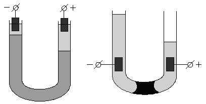 поместив в U-образную трубку какой-либо окрашенный золь, поверх которого налит не смешивающийся с золем бесцветный электролит. Если опустить в электролит электроды и наложить разность потенциалов, то граница окрашенного золя в одном из колен трубки будет подниматься, в другом – опускаться (рис. 2). Если поместить в U-образную трубку пористую перегородку (например, мелкий кварцевый песок) и заполнить её водой, то при наложении разности потенциалов в одном колене будет наблюдаться подъем уровня жидкости, в другом – его опускание (рис. 3). Движение дисперсной среды в электрическом поле относительно неподвижной дисперсной фазы (в рассмотренном случае – относительно поверхности пористых тел) называется электроосмосом. Явления электрофореза и электроосмоса получили общее название электрокинетических явлений.