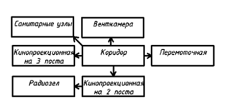 кинопроекционная на 2 поста, венткамера, перемоточная, радиоузел.