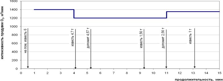 Продувка кислородом ведется сверху при интенсивности 1200 нм3/мин, в первые и последние минуты продувки интенсивность составляет до 1400 нм3/мин.