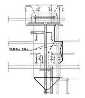 Шламовая вода через ловушки колено-сепаратора и бункера после каждой ступени труб Вентури попадает в гидрозатвор, общий шламопровод и направляется в оборотный цикл водоснабжения.