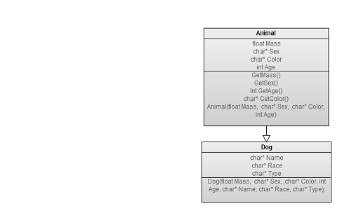 класса class Dog:public Animal. Класс dog наследует от класса animal такие поля как mass, sex, color, age. Также класс dog имеет свои собственные поля (name, race).