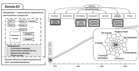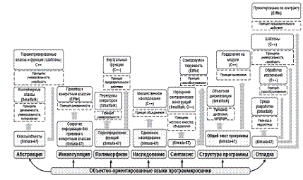Язык можно охарактеризовать набором механизмов реализации объектно-ориентированных возможностей (рис. 2). Simula-67 выступает «первенцем» ООП, и набор механизмов в языке нельзя назвать идеальным. С увеличением сложности решаемых объектно-ориентированных задач разработчики столкнулись с рядом противоречий.