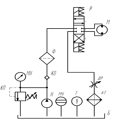 Структурная схема привода показана на рисунке 1. На рисунке изображён объемный гидропривод с замкнутой циркуляцией жидкости. Для подачи жидкости используется не регулируемый насос «Н» с реверсивным потоком и с регулируемой подачей. Жидкость поступает из бака «Б» к насосу через всасывающий патрубок. Затем поступает в напорный трубопровод. На напорном трубопроводе установлен клапан обратный «КО», который предотвращает попадание жидкости назад в насос. Клапан предохранительный «КП» служит для предотвращения избыточного давления и для сброса жидкости в бак. Так же установлен манометр «МН», который предназначен для слежения за давлением в гидросистеме. Далее пройдя через напорный фильтр «Ф», который очищает рабочую жидкость от механических примесей. Рабочая жидкость подается к распределителю «Р» с электромагнитным управлением.