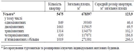 Впродовж 2011р. здано в експлуатацію 5475 квартир, з них 4480 - у міських поселеннях, 995 - у сільській місцевості. Серед збудованих квартир переважають двокімнатні та трикімнатні, на які припадає 36,8% введеної в експлуатацію загальної площі житла.