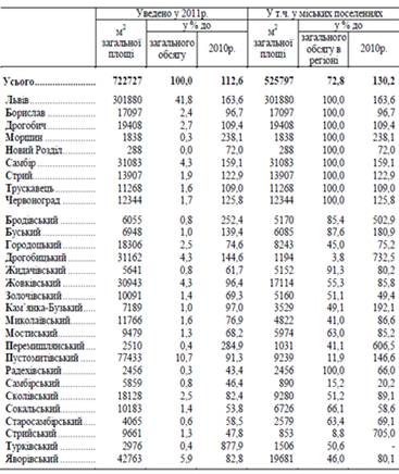 У 2011р. за рахунок будівництва нових житлових будинків та розширення існуючого житлового фонду на Львівщині введено в експлуатацію 722,7 тис.м2 загальної площі житла, що на 12,6% більше, ніж у 2010р.