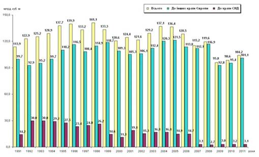 Щороку транспортується для споживачів України близько 50-60 млрд. куб. м і транзитом до країн Західної та Центральної Європи 110-120 млрд. куб. м. природного газу (рис. 1.). На сьогодні існує технічна можливість для збільшення транзиту газу в країни Центральної і Західної Європи до 142 млрд. куб. м на рік без розширення газотранспортної системи.
