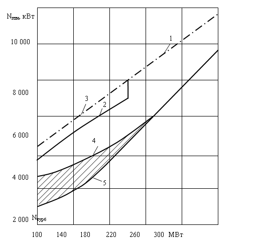 На рис. 1.4. приведена зависимость изменения мощности потребляемой питательным насосом блока мощностью 300 МВт при изменении нагрузки и работой с различными способами регулирования.