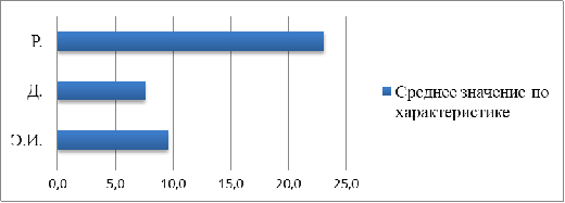 По совокупности значений высоких уровней Р. и Э.И., среднего уровня Д. была произведена выборка из 45 респондентов, включившая результаты 3 опрошенных, 2 представителей мужской гендерной группы и 1 участников женской. Сформированная группа объединила результаты «0», «1», «2» статуса должности по 1 человеку в каждом соответственно. По полученным результатам среднее в целом значение по характеристике в выборке из 3 человек по Э.И составило 25,7 балла,; по Д. 8,3 балла, что превышает возможный средний порог характеристики в 7,5 балла . Уровень Р. составил 22,7 баллов.