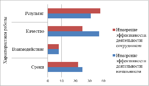 Таким образом, по результатам сравнительного анализа определено совпадение представлений об оценке характеристик сотрудника при измерении эффективности деятельности сотрудником и начальником. Это отображает грамотное формулирование требований к деятельности сотрудника начальником и четкое следование персоналом в организациях, где работают 45 опрошенных управленцев. Проведенный анализ показал, что по сумме упомянутых параметров оценки эффективности деятельности управленца, характеристики работы приоритетнее над характеристиками сотрудников (194 параметра в противопоставлении с 172) .