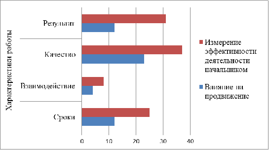 По полученным результатам среди характеристик работы с позиции анализа показателей эффективности деятельности самыми выраженными оказались параметры результата, включающие 38 упомянутых 45 респондентами критериев. Следующей классификацией является группа характеристик качества выполняемой работы, состоящего из 25 критериев. Средней по степени выраженности характеристик работы определена группа сроков работы. Наименьшее количество упомянутых факторов оценки управленческой эффективности деятельности с позиции ее измерения сотрудниками принадлежит критериальной группе взаимодействия.