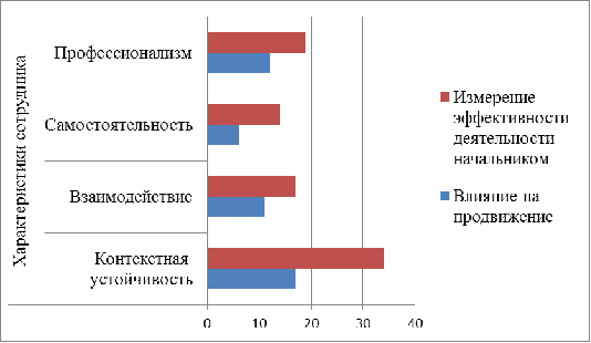 По полученным данным распределения наблюдается совпадение последовательности позиций контекстной устойчивости, профессионализма, взаимодействия и самостоятельности среди 45 респондентов из организаций на территории г. Санкт- Петербург. Однако, прослеживается доминирование степени выраженности показателей характеристик, измеряемых эффективность деятельности начальником, над влиянием на продвижение по карьерной лестнице. Это свидетельствует о расхождении критериев оценки характеристик сотрудника как параметров эффективности деятельности менеджеров с критериями оценки, определяющими карьерный рост.