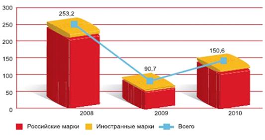 В 2010 г. в РФ было произведено 150,6 тыс. грузовых автомобилей. В структуре производства этих транспортных средств преобладают отечественные марки. На их долю приходится 90,3% всех произведенных в России грузовых автомобилей. Доля иностранных марок в структуре производства грузовиков с каждым годом увеличивалась - с 7,3% в 2008 г. до 9,7% в 2010 г (см. рисунок 8). Во многом этому способствовало оживление производства на заводах группы Sollers и открытие в 2009 г. завода по выпуску грузовой техники Volvo и Renault в Калуге. С апреля 2010 г. запущено производство грузовых автомобилей Scania.