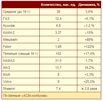 Продажи грузовых автомобилей полной массой до 16 т выросли на 3,6% (до 36 тыс. ед.). Доминирует в рейтинге ГАЗ с показателем 12 400 ед. (+5,1%). Вторую позицию занимает Hyundai с отрицательной динамикой 1,2%, далее идет «КАМАЗ», также потерявший 15% рынка. Mitsubishi и Foton показали высокие темпы роста - 88 и 122% соответственно.
