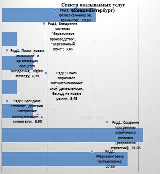 В ходе анализа было выявлено, что во всех городах основными направлениями деятельности компаний являются проведение бизнес-семинаров, тренингов; разработка стратегий и маркетинговые исследования. Однако стоит отметить, что в Москве и Санкт-Петербурге, последние две услуги предоставляются в комплексе (сначала анализ рынка, затем стратегия), а в Нижнем Новгороде услуга формирования стратегии основывается только на методиках, которые доступны при заказе тренинговых сессий.