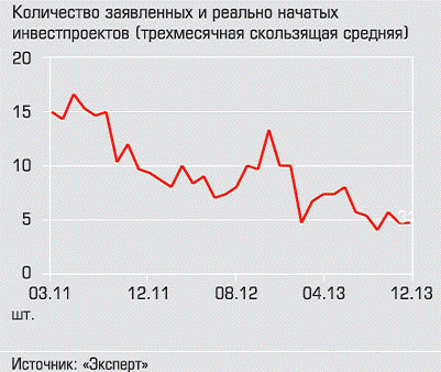 заявлений о намерениях и количество реально начатых проектов падает (см. рис.