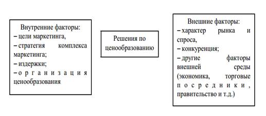 На величину цены оказывают воздействие внутренние и внешние факторы. К числу внутренних факторов относятся: маркетинговые цели предприятия, стратегия маркетингового комплекса, издержки производства, организация ценообразования.