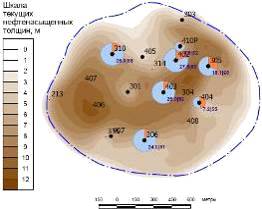 В пределах контура нефтеносности на Западном поднятии нефтенасыщенная толщина пласта по скважинам изменяется от 2,7 до 10,3 м (рисунок 1.2), средневзвешенная нефтенасыщеная толщина составляет 6,6 м.