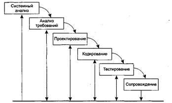 Очень часто классический жизненный цикл называют каскадной или водопадной моделью, подчеркивая, что разработка рассматривается как последовательность этапов, причем переход на следующий, иерархически нижний этап происходит только после полного завершения работ на текущем этапе (рис. 1).