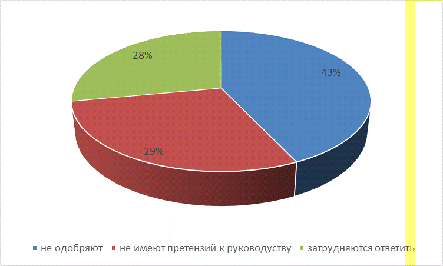 Согласно рисунку, 43% опрошенных не одобряют действия руководства в кризис. Некоторые из них считают антикризисные меры несправедливыми по отношению к ним (лишение премий, понижение или несвоевременная выплата заработной платы, несправедливые увольнения). Часть жалуется на ужесточение рабочего режима, увеличение нагрузок плохое отношение и грубость со стороны руководства. Другие считают, что руководство не принимают активных мер по устранению кризиса и по борьбе с его последствиями.