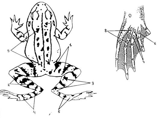 1- Число полос на дорсальной стороне бедра; 2 - число полос на дорсальной стороне голени; 3 - число полос на дорсальной стороне голени; 4 - число полос на стопе; 5 - число пятен на стопе; 6 - число белых пятен на плантарной стороне второго пальца задней конечности; 7- число белых пятен на плантарной стороне третьего пальца задней конечности; 8 -число белых пятен на плантарной стороне четвертого пальца задней конечности; 9 - число пятен на спине.