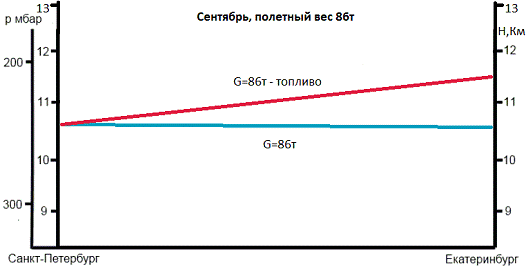 Проанализировав таблицы, не трудно заметить, что при полете по данному маршруту температура воздуха на указанных высотах изменяется незначительно, поэтому изменение предельно допустимой высоты полета зависит, в первую очередь от выработки топлива. Графики также наглядно подтверждают это.