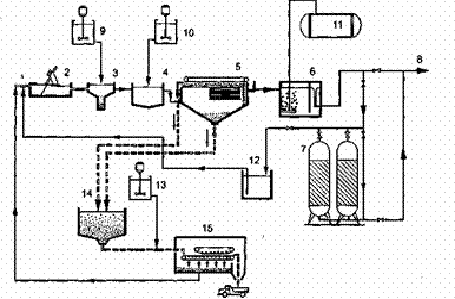 1, 8 - подача сточных вод и отведение очищенной воды; 2 - решетка; 3 - песколовка; 4 - камера флокуляции; 5 - отстойник-флотатор; 6 - контактная камера; 7 - адсорбционные фильтры; 9 - подача коагулянта; 10 - подача флокулянта; 11 - озонатор; 12 - резервуар грязных промывных вод; 13 - подача полиэлектролита; 14 - уплотнитель осадка; 15 - фильтр-пресс