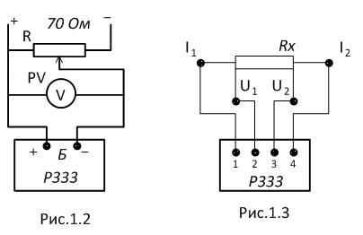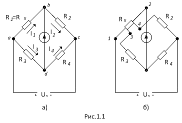 Збираємо схему (мал. 1.2), живлення моста здійснюється від зовнішнього джерела. Напруга живлення моста вибирається згідно табл. 1.1 залежно від передбачуваної величини вимірюваного опору.