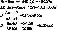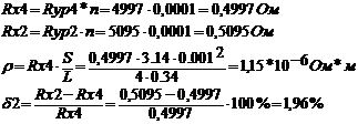 За результатами виміру Rx і по заданим довжині L, і діаметру d дротових опорів розраховуємо питомий опір. Вимірюємо той самий опір по двозажимній схемі, для чого міст готуємо згідно п.3. Розраховуємо погрішності виміру малих опорів по двозажимній схемі, прийнявши за дійсне значення величину обмірюваного опору по чотиризажимній схемі включення: