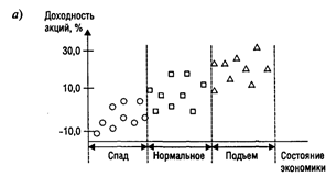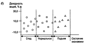 Рассмотрим графическую иллюстрацию зависимости ставки доходности акций от положения дел в экономике страны (рис. 1, а). Здесь исследуемым фактором является уровень состояния экономики (точнее, три уровня ее состояния), а результативным признаком - ставка доходности. Приведенное распределение показывает, что данный фактор оказывает существенное влияние на доходность, т.е. с улучшением дел в экономике растет и доходность акций, что не противоречит здравому смыслу.