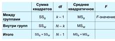 В столбце «F» приведено отношение среднего квадрата между группами к среднему квадрату внутри групп.