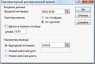 . В поле ввода Альфа группы элементов управления Входные данные по умолчанию отображается величина 0,05, которая связана с вероятностью возникновения ошибки в дисперсионном анализе.