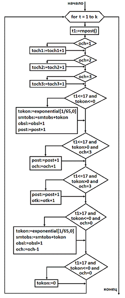 Процедура реализованная по данной блок-схеме была запущена в цикле 10 раз при времени исполнения к=5000 и посчитано средне арифметическое выводимых параметров для получения более точных данных. В результате выполнения программы выводится среднее время пребывания 1-ой заявки, 2-ух заявок и 3-ех заявок ожидающих обслуживания.