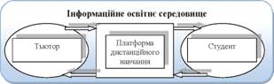 Процес інтеграції ІКТ в освітню діяльність має два рівні поширення - локальний і глобальний. Локальний рівень характеризується впровадженням комп’ютерних засобів безпосередньо в межах навчальної аудиторії за принципом web 1.0. Тоді як глобальний рівень отримав назву «e-learning» або електронне навчання в межах концепції web 2.0. Електронне навчання передбачає можливість навчання за допомогою персонального комп’ютера та мережі Інтернет безпосередньо в навчальній аудиторії, а також у віддаленому (дистанційному) режимі. Враховуючи те, що ми будемо акцентувати увагу на електронному дистанційному навчанні майбутніх магістрів сестринської справи, тому доцільним вбачаємо розгляд тривіальної моделі ЕДН (рис. 1), запропонованої М. Омаровим та В. Мурадовою [3], яка охоплює мінімальний набір елементів: тьютор, студент та платформа дистанційного навчання.