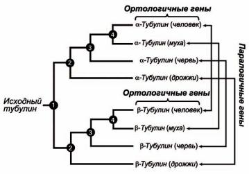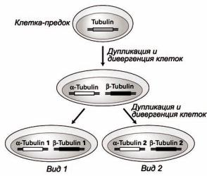 В случае тубулина паралогичными являются генные последовательности α- и β-тубулинов, которые дивергировали в результате дупликации генов.