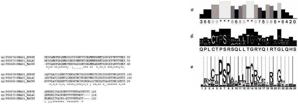 Рисунок 22 – Результат множественного выравнивания аминокислотных последовательностей панкреатических эндонуклеаз лошади, малого полосатика и большого рыжего кенгуру
