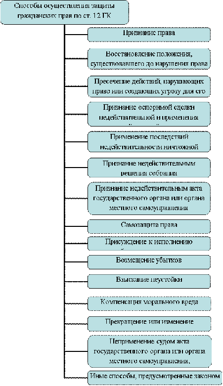 Способы защиты гражданских прав можно определенным образом классифицировать. Классификация на основе ст. 12 <consultantplus://offline/ref=E055BE04CDC138CF53CB849DF18B5BE984B736DF822C01DD9A36E0565A2268C02C419067F35369A6U9z8P> ГК РФ одна из наиболее распространенных в юридической литературе. В соответствии с ней гражданско-правовые способы защиты делятся на общие (универсальные) и специальные. В качестве критерия деления выступает сфера действия или применения того или иного способа. При этом способы защиты, включенные в перечень ст. 12 <consultantplus://offline/ref=E055BE04CDC138CF53CB849DF18B5BE984B736DF822C01DD9A36E0565A2268C02C419067F35369A6U9z8P>, рассматриваются как общие (представлены на рисунке 1), а способы, предусмотренные другими нормами ГК и нормами иных законов, как специальные.