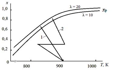 хр – равновесные степени превращения; λ – отношение пар : газ; 1 – режим процесса в однослойном реакторе; 2 – режим процесса в двухслойном реакторе