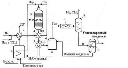 1 – пароперегревательная печь; 2 – испаритель этилбензола; 3 – реактор дегидрирования; 4 – подогреватель этилбензола; 5 – котел-утилизатор (подогреватель воды); 6 – пенный аппарат; 7 – воздушный холодильник; 8 – сепаратор; 9 – разделитель фаз;
