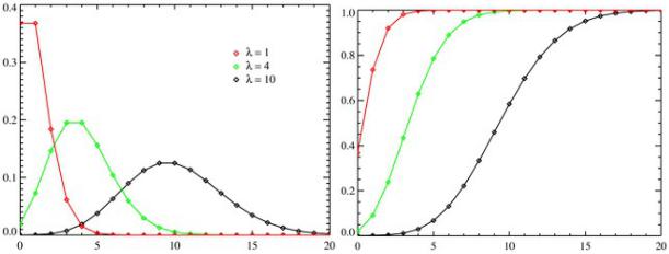 Здесь - среднее число событий, происходящих с интенсивностью λ за заданный временной интервал t, k-число событий, происходящих за время t.