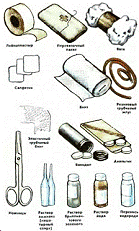 Все транспортные средства укомплектованы специальными аптечками, а автохозяйства - аптечными шкафами, в которых имеется самое необходимое для оказания первой помощи: бинты, вата, жгут, раствор йода и др. Однако зачастую этих средств недостаточно, а некоторые просто отсутствуют. На рисунках показаны официальные средства, которые могут быть рекомендованы для стационарных и портативных аптечек (различаются преимущественно количеством перевязочного материала).