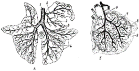 концевых бронхов с альвеолами. 1 - трахея; 2 - разветвление трахеи; 3 - главный